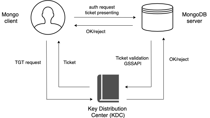 A MongoDB client sends the Ticket-Grantng Ticket (TGT) request to the Key Distribution Center (KDC)